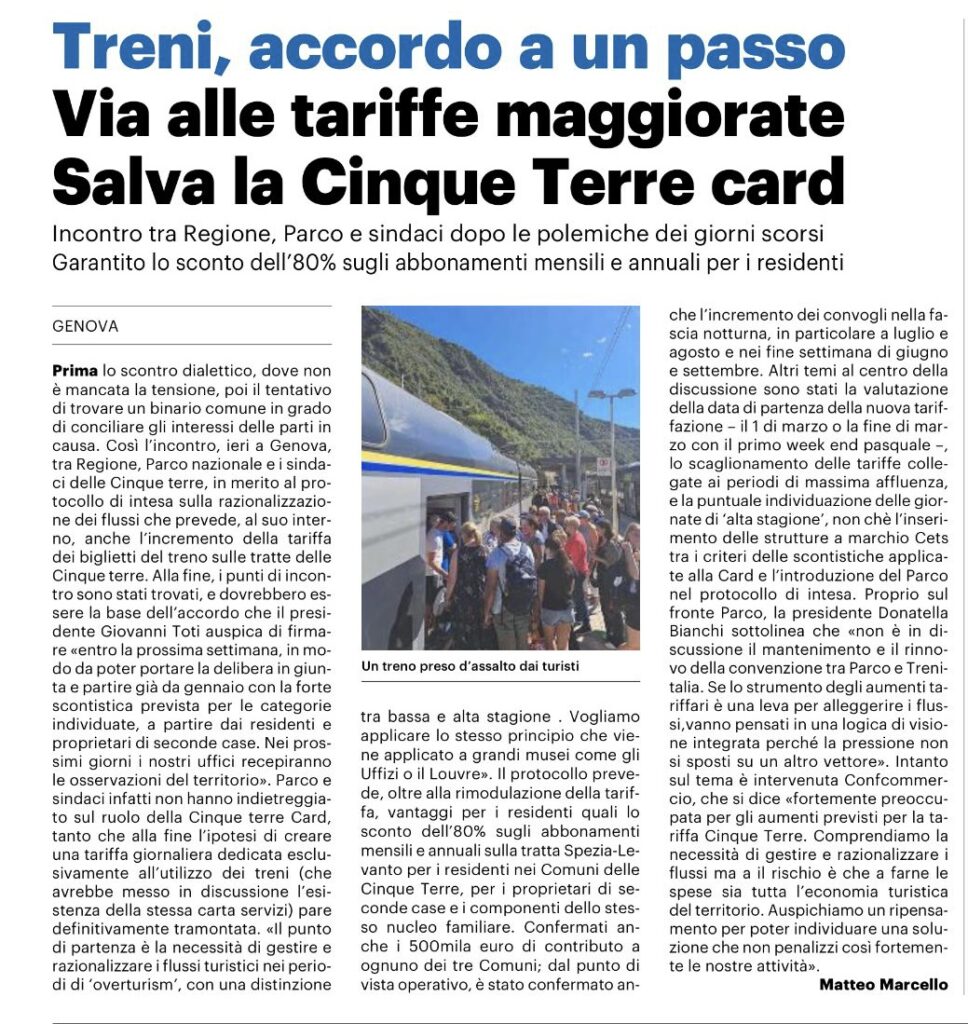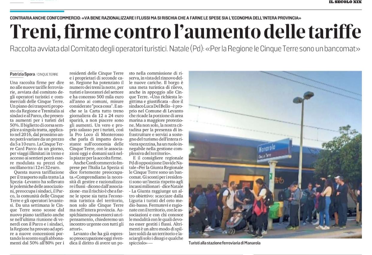Confcommercio Imprese per l’Italia La Spezia è fortemente preoccupata per gli aumenti previsti per la tariffa del Cinque Terre Express.